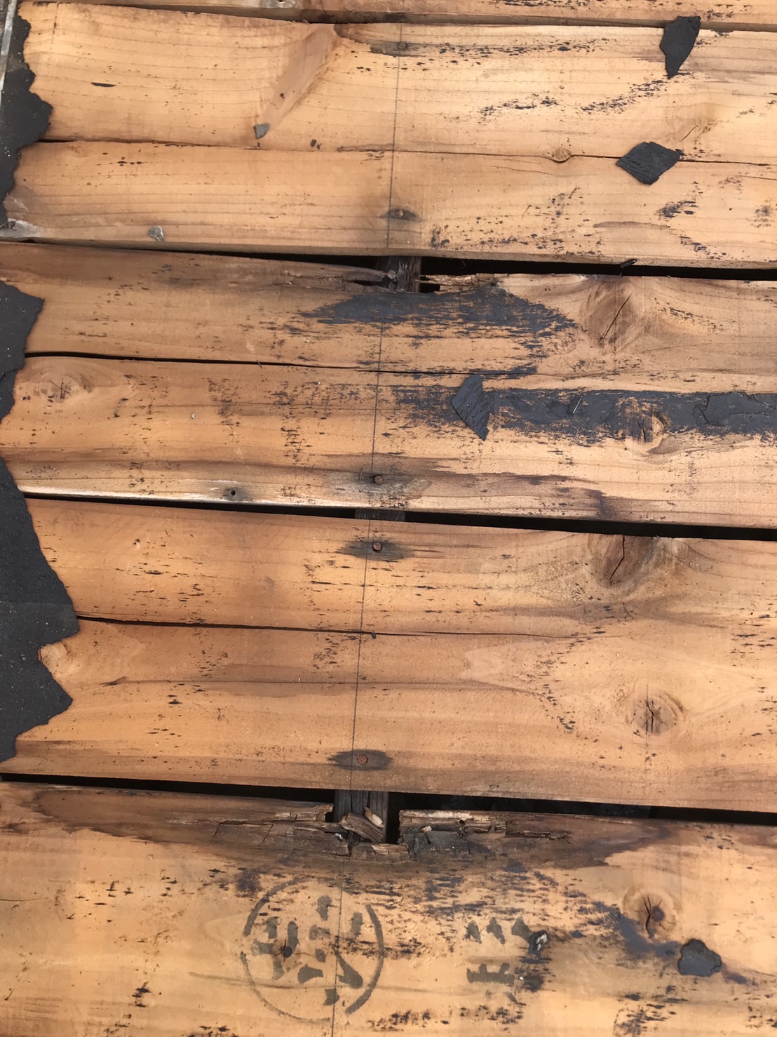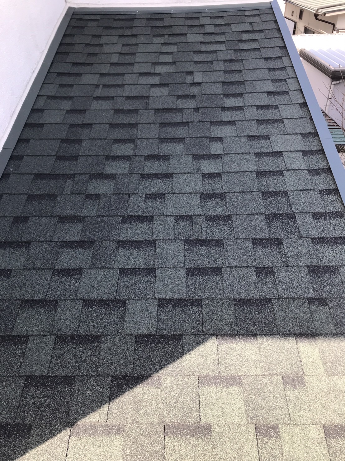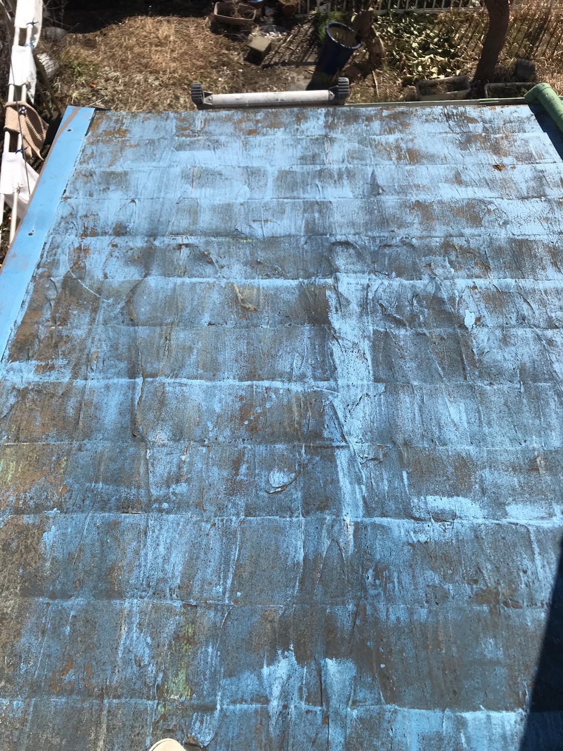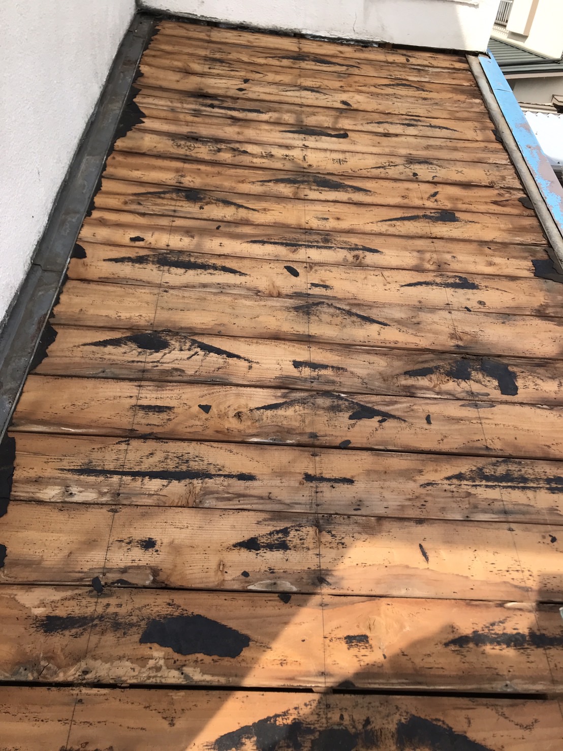 【現地調査】モルタル塗りの破風が落ちてしまっていました。これは、屋根からの雨水の侵入が原因です。早速屋根に上がってみると、この様な状態でした。当社で雨漏りの修理をした箇所と反対側の屋根で気が付かなかったのですが、驚きました。以前に写真の屋根の下の部屋の天井に雨漏りが発生し、他の業者に依頼をして修理をしたとお聞きしていましたが、とても酷い状態です。既存のスレート瓦の上から対策はおろか、何の下地処理も施工せずに、防水剤を塗りたくっていました。ケレンや水洗浄、プライマーなどの下地処理をしないで防水剤を塗っている為に所々剥がれて浮き上がり亀裂も入っています。この状態では、雨漏りが起きるのも当然です。破風や軒天の下地も心配ですが、屋根自体の下地も心配です。ただ根本的な問題は、建築時の設計にあります。2寸勾配と少ない傾斜に3寸5分の勾配が必要なスレート瓦で屋根を仕上げてしまった事です。これでは雨水の流れが悪く縦や横の継ぎ目や重ねから入った雨水が完全に外に出られず、屋根の中まで浸水してしまいます。雨漏りを直しに来た業者もそれが分かっていたのではないかと思います。だから「手っ取り早く防水工事で済ませよう。」と考えたのではないかと思います。屋根は、屋根材の重ねや継ぎ目、水切り部材などの段差や隙間が多数あります。マンションなどの屋上やベランダなど平らで滑らかな面に施工する防水剤で対応出来るないのです。当社でもベランダや屋上などの防水工事を施工しますが、その際にはちょっとした不陸やクラックにも気を付けて補正や補修をしてから施工します。その材料を段差だらけの屋根に使うとは…とにかくお客様に事態を説明し、最低限この屋根だけでも葺き替える事を提案しました。本来ならこの建物の屋根は同じ傾斜なので全体的に改修をした方が安心なのですが、とりあえず問題の屋根の修繕をする事になました。【対策工事】既存の屋根材を撤去して屋根の下地を出します。築年数の経っている家なので野地板は合板では無くバラ板を使用していました。何箇所かは、スレート瓦の釘打ちのラインとバラ板の隙間が合ってしまい釘が、効いていない状態でした。劣化している防水シートを剥がし確認すると何箇所か雨漏りの痕跡が有り下地の腐食が有りました。野地板だけでは無く垂木も腐食していたので、野地板を切り取り垂木を添木補強します。添木補強をしたら既存の野地板を戻し、全体に構造用合板を上貼りします。垂木に添木補強をして、全体に構造用合板を貼ったので、下地の補強は万全です。破風の下地にも構造用合板を貼って補強しました。屋根は構造用合板の上に防水シートを貼り、破風の方には無機質板を貼ります。防水シートを貼り軒先や袖の水切り部材を取り付けてファイバーグラスの屋根材を施工します。破風は、無機質板の目地のシーリングをします。屋根はこんな感じに仕上がりました。ファイバーグラスの屋根材なのでこの屋根の様に勾配が緩くても雨水が中に廻る心配も無く、メンテナンスのサイクルも長く、屋根材の重量も軽いのでメリットが多く仕上がりも綺麗なのでお勧めです。破風は目地のシーリング処理の後、シーラーで下地処理をして微弾性フィラーでパターンを付けて、シリコン樹脂塗装で仕上げました。塗料の乾燥後、雨樋を取り付けて完成です。【雨漏りや屋根のことでお困りの方】雨漏りバスターズは横浜市や藤沢市を中心に35年雨漏り修理や屋根工事を請け負っています。大工出身の私たちだからこそできる技術でその場しのぎではない、”2度と雨漏りしない屋根”に直します。ぜひ一度当社へご相談ください。まずはお電話でお話を聞き、現地調査→原因と対策工事をご案内→お見積りご提示をし、ご納得いただいてからの工事になります。お電話:0120-965-696/090-3525-1001お問い合わせフォーム無理な勧誘などはしておりませんので、どうぞ安心してご相談ください。