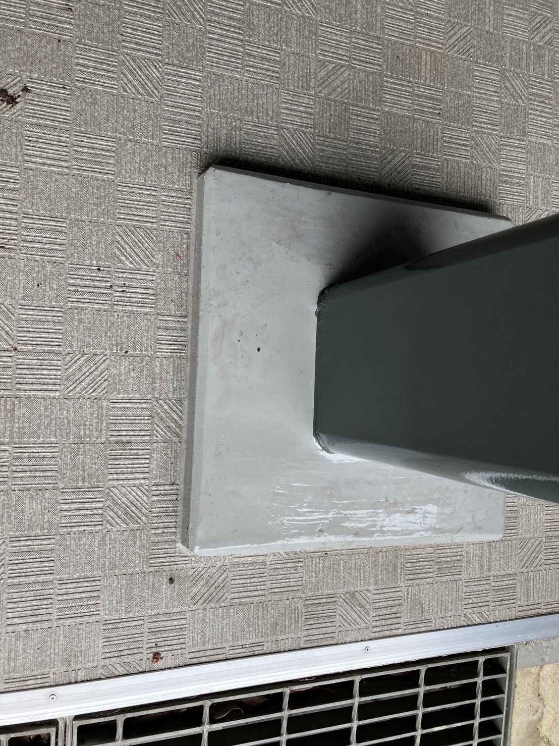 基礎との接合部を専用のシール材でシーリング処理をして、端部をアルミ部材で押さえて施工終了です。鉄骨の柱の周囲のモルタルにはウレタン塗膜防水をして、柱はウレタン樹脂塗装をしました。