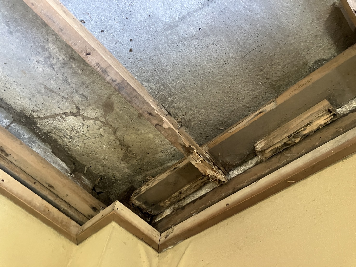 前の道路よりも建物の基礎が低く、外壁の隙間から雨水が侵入していました。その当時はシーリング処理と塗装で雨漏りを直しました。今年の大雨での再発もなく、ご入居者様が退居されたので、オーナー様からの依頼で床の改修工事を行うことになりました。【現地調査】中はこんな状態です。 4.5畳の部屋は畳をあげると、下地の床板が湿気とカビで黒く変色しています。6畳の部屋はさらに状態がひどく、畳を上げると床が腐食して穴が開いていました。