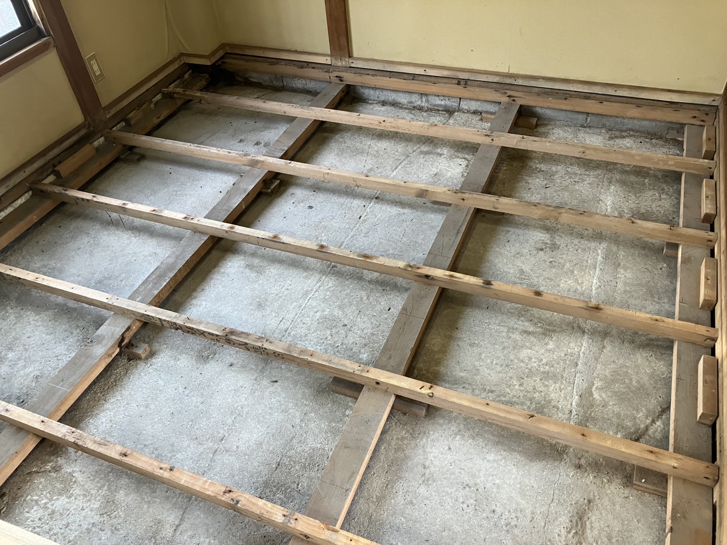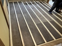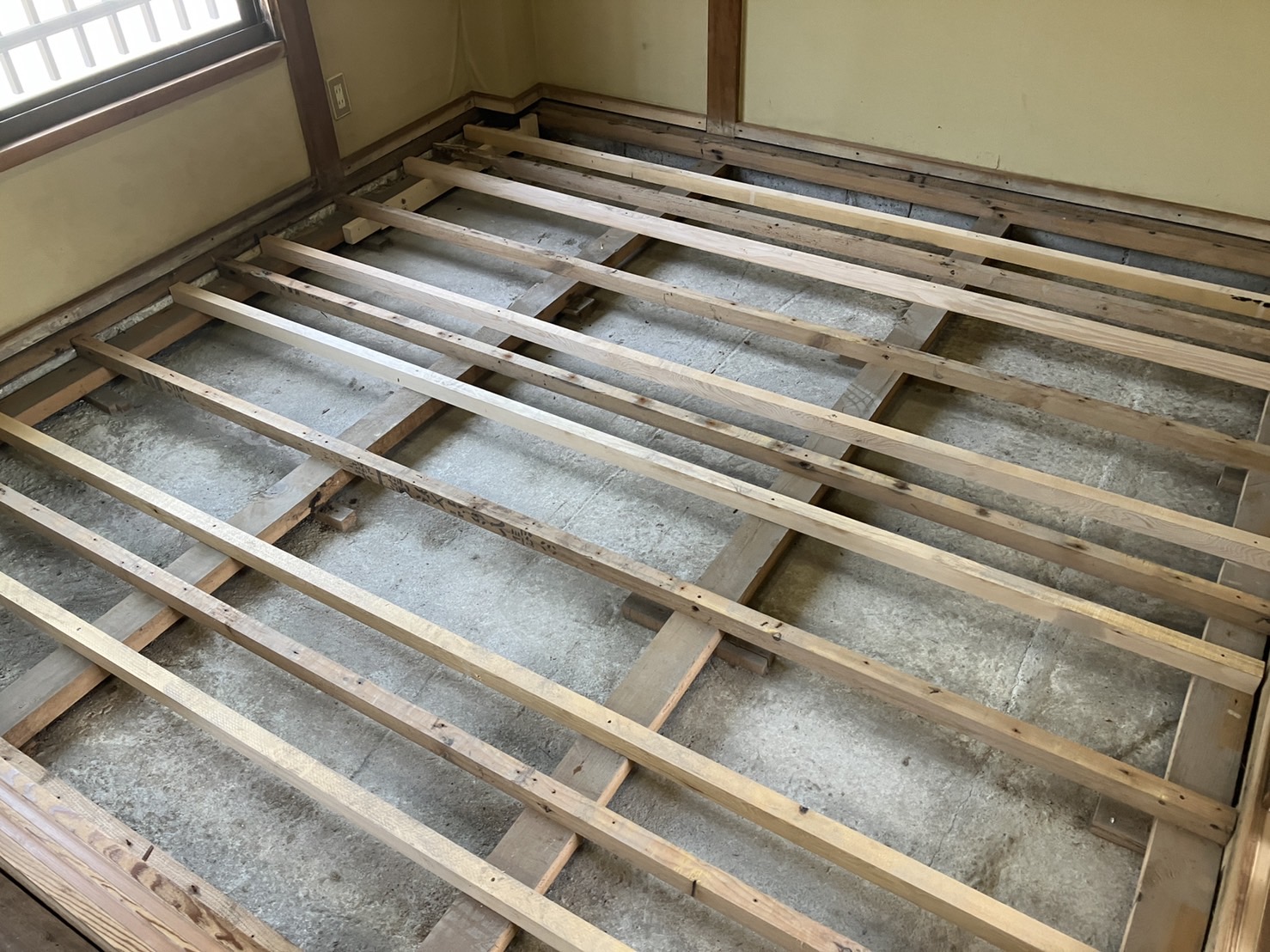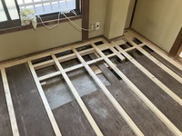 土間がコンクリートだったこともあり、思っていたよりは被害が少なかったです。腐食して弱くなった大引や掛かりを補強して根太を取り付けます。いろいろな施工方法がありますが、今回は既存の根太が比較的しっかりしていたので、その間に30センチ間隔になるように取り付けました。腐食していた箇所もしっかり補強します。根太の取り付けが終わり、畳の下地になる床板になる構造用合板を貼ります。