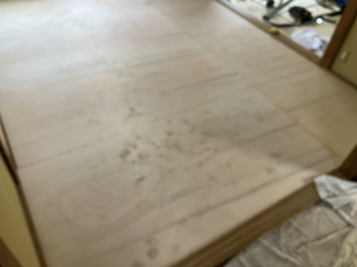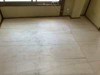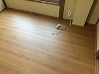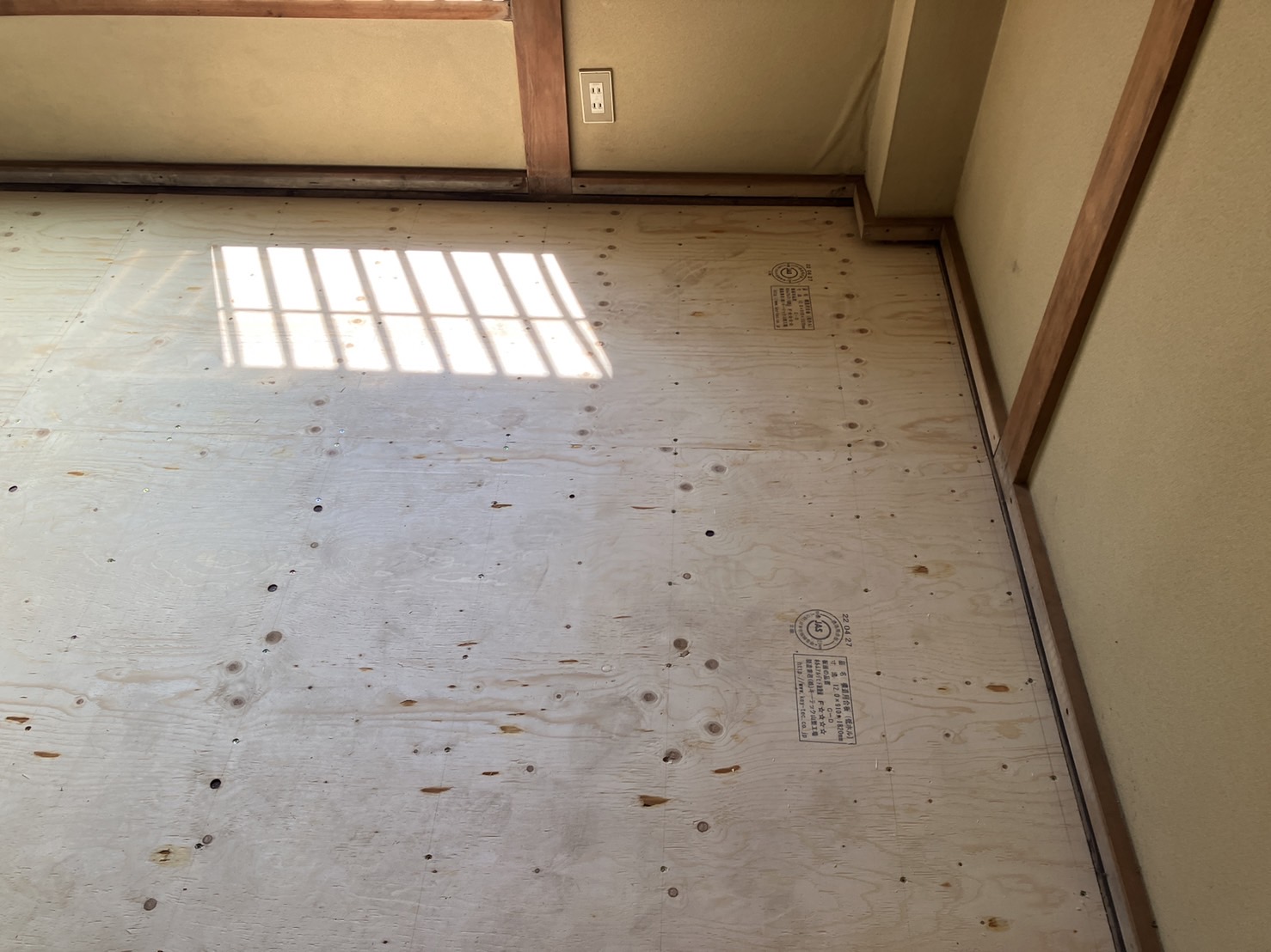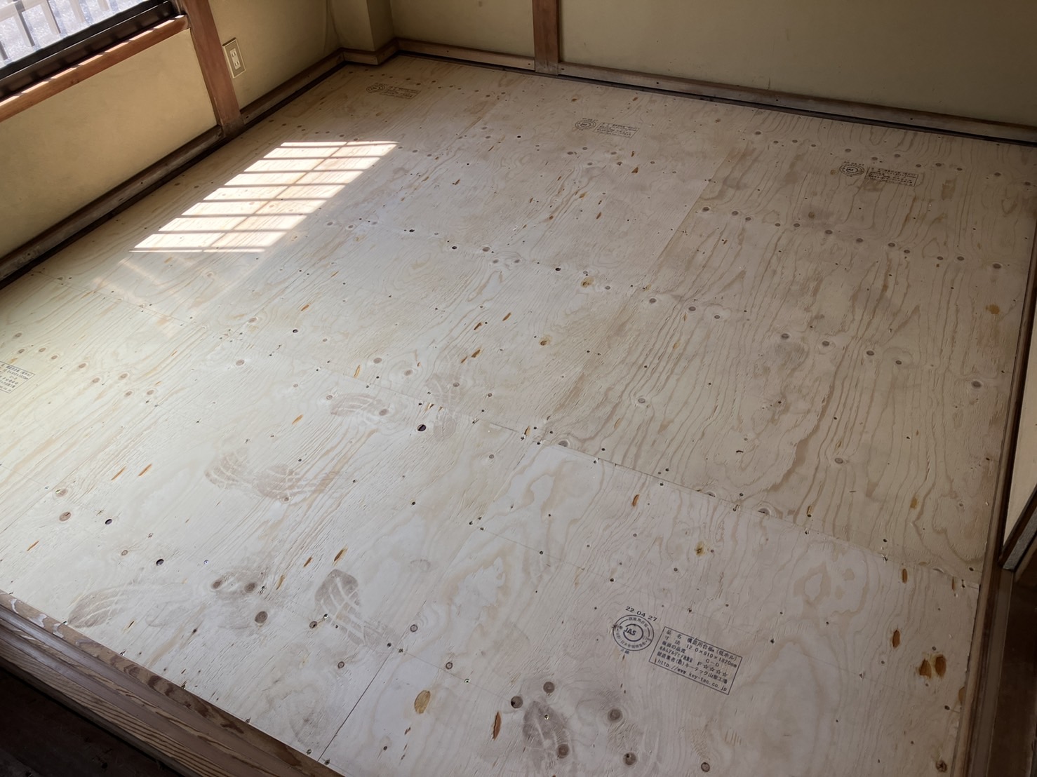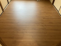 4.5畳の部屋と同じ様に取り付けた根太に構造用合板を貼ります。 構造用合板の上にフローリングを施工します。和室の畳からの変更なので、既存の柱や敷居、畳寄せなどの形状に合わせて端部を切断して貼ります。貼り上がりはこんな感じです。