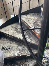 踏面は下地にモルタルを打ってあり、側板も問題のない状態でしたので、蹴込部分に現地の段に合わせて切断加工をした鋼板を溶接留めして補強と修繕をしました。