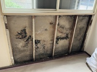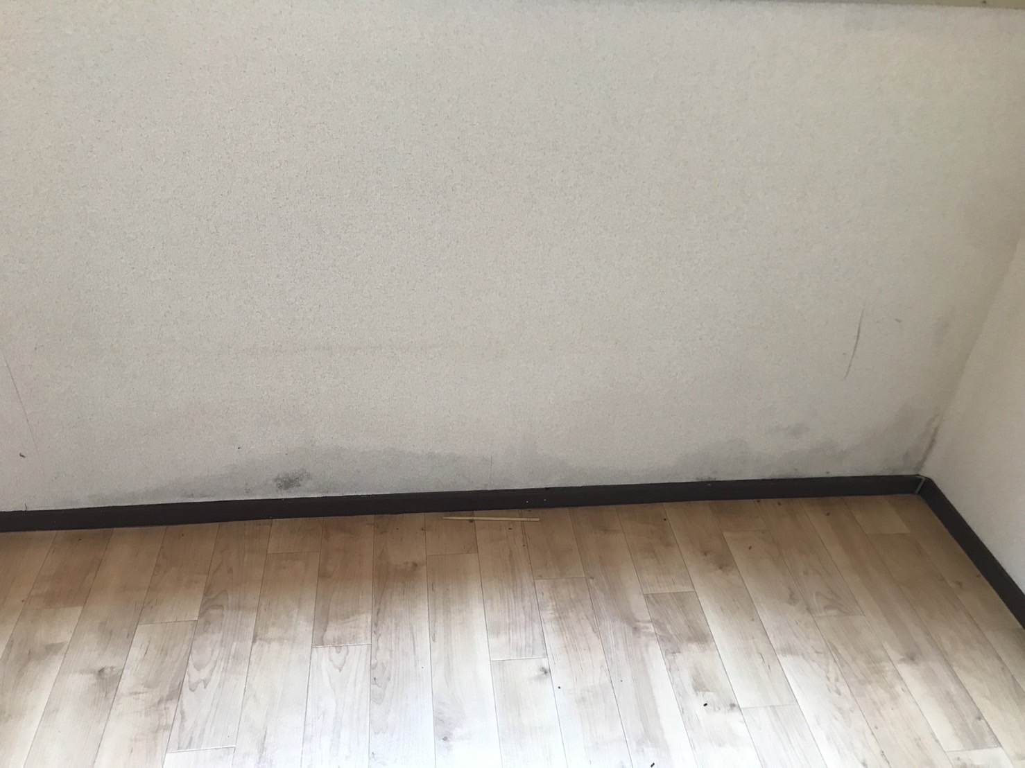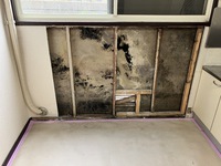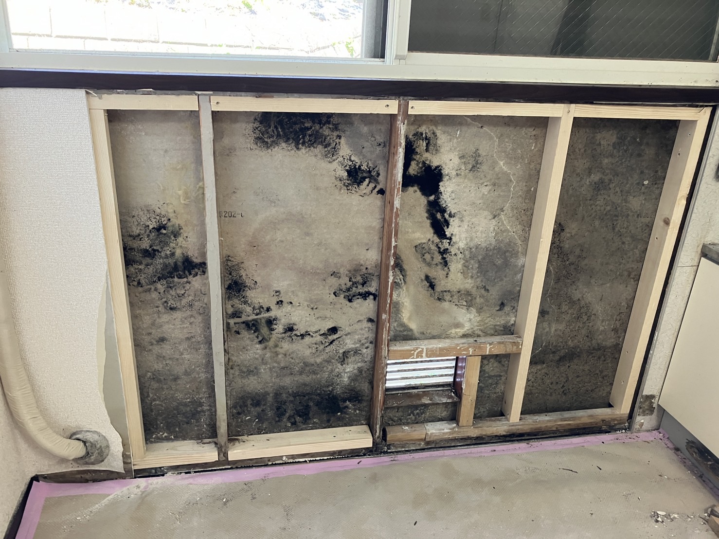 テープを剥がして完了です。雨漏りの心配がなくなったので、室内の壁を修繕します。雨染みのあった壁のボードを剥がすと外壁の裏側はこんな状態でした。 カビが発生して黒くなり裏側から劣化が始まる寸前でした。