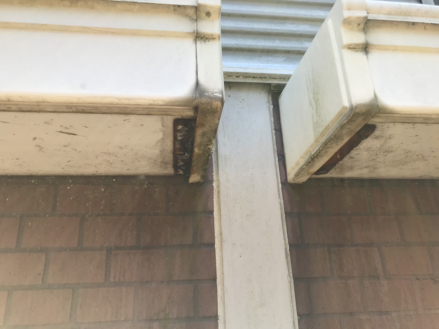 窓上の壁には雨漏りの染みなどは見当たらなかったので、雨漏りの原因はこの窓廻りにあります。外壁を確認します。窓上の外壁のシーリングは多少の劣化はありますが、まだ大丈夫そうです。ただし窓枠のシーリングの劣化の可能性があります。窓下に付いているフラワーボックスはかなり悪い状態で雨水が貯まるのか周辺のサイディングはカビのような跡が付いています。