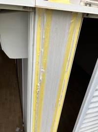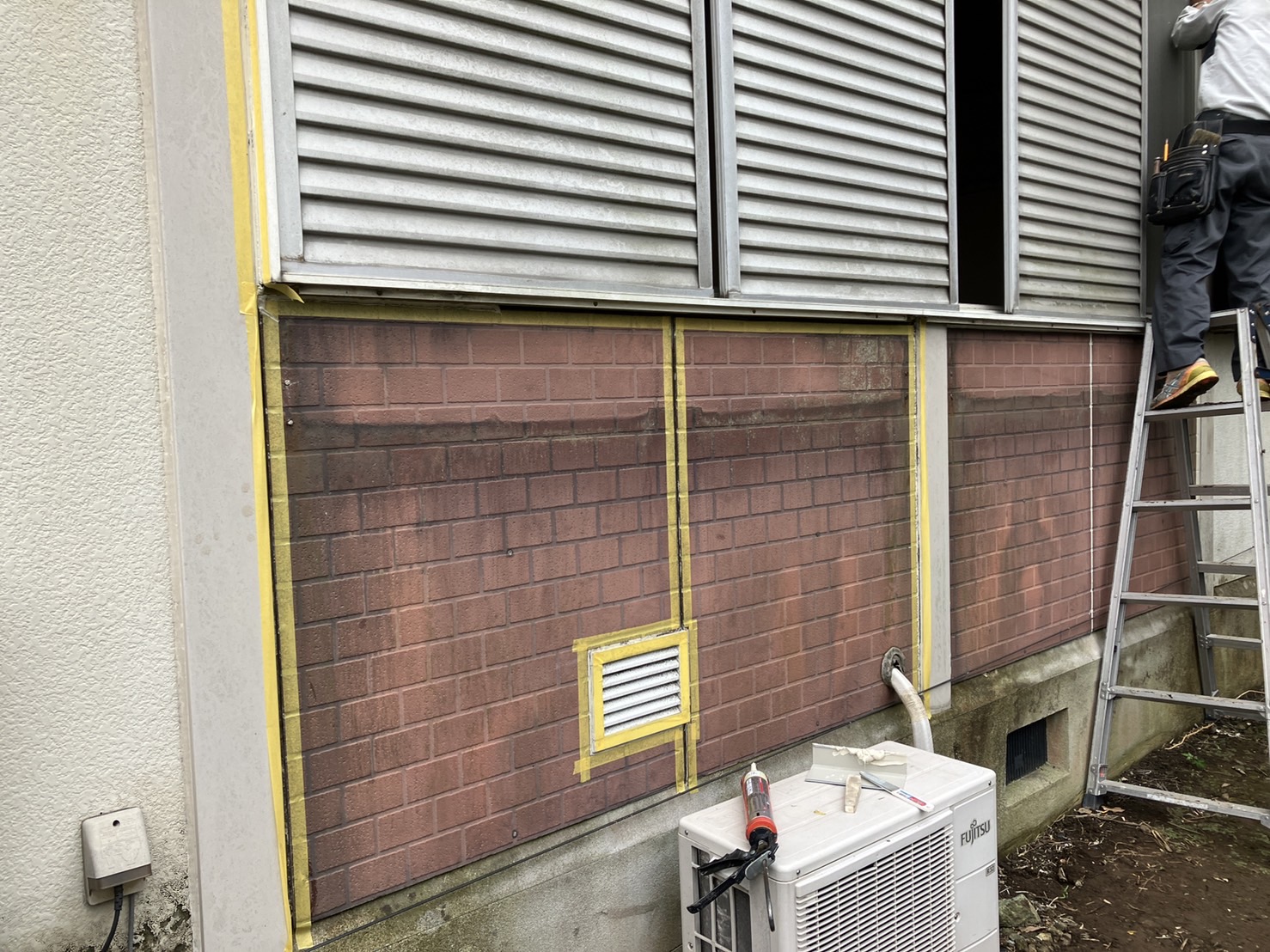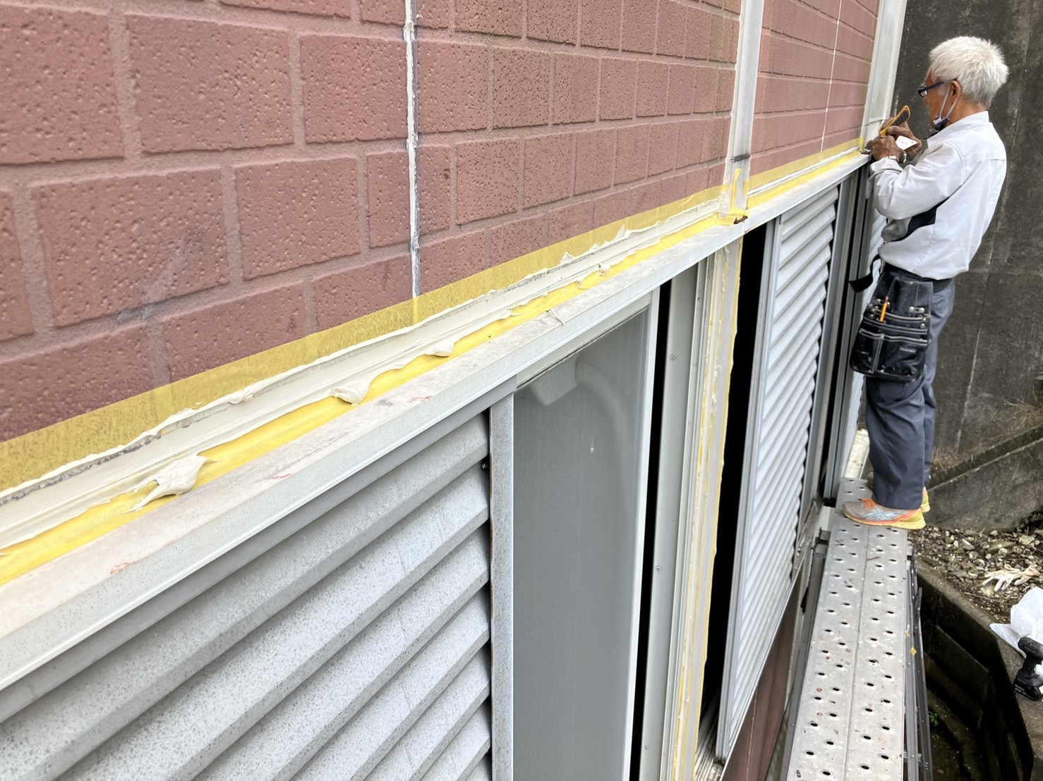 まずは窓廻りと外壁のシーリング処理です。マスキングテープで養生をして、プライマーで下地処理をします。 シーリング材を充填してヘラで成形します。