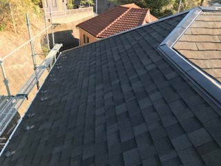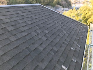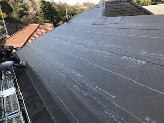 神奈川県横浜市泉区でスレート瓦屋根の修理工事です。既存のスレート瓦を撤去して、下地補正の耐水合板を施工後、防水シートを貼ります。一般的なアスファルトルーフィングでも良いのですが、当社では改質アスファルトルーフィングを使っています。この防水シートは、一般のシートよりも表面の防水性が高く、内部の繊維質も強いので施工性も良く、屋根材の施工中に表面が傷ついたり破れたりする心配も有りません。防水シートの施工後、ファイバーグラスの屋根材を葺き上げます。専用の接着剤と専用の釘を併用します。屋根材の施工後、棟部分に防腐処理済の木桟をビス留めしてカルバリウム鋼板の棟部材を取り付けで工事修理です。