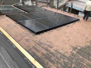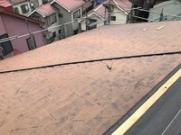 神奈川県横浜市金沢区で鋼板屋根からの雨漏りです。二階の天井から雨漏りがするとの連絡を頂き、原調に伺いました。屋根に上がってみると2寸5分くらいの緩い勾配に鋼板屋根を施工していました。また、お客様の話では元の屋根はスレート葺きで、剥がさずにその上に鋼板屋根を施工したとの事でした。この屋根の緩い勾配では、スレート屋根でも鋼板屋根でも無理が有ります。その上、カバー工法なので雨漏りの箇所も原因も上からでは解りません。何でカバー工法が存在するのか、甚だ疑問です。お客様に状況を説明して、御納得頂き屋根の吹き替え工事を施工する事になりました。勿論、鋼板屋根もその下のスレート屋根も全て剥がします。上の鋼板屋根を剥がしてみると、勾配が緩い為か中に水が廻り下の発泡シートがシミだらけです。発泡シートを剥がすと下の古いスレート瓦はビショビショに濡れています。カビも生えています。カバー工法の場合、雨漏りが始まると上の屋根材と下の古い屋根材の間に入った雨水はいつまで乾く事が無く屋根の木下地を痛めます。家にとっては、最悪の状態です。金額などの問題もあるかもですが、後々の事を考えるとやはりカバー工法は勧められません。しかもどんなに軽い屋根材を使用しても、古い屋根材はそのままなので、荷重が増え家の負担にもなります。