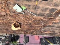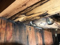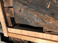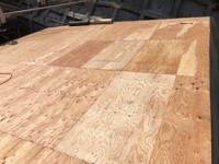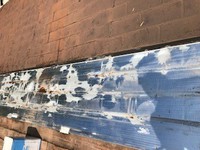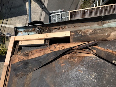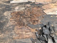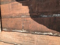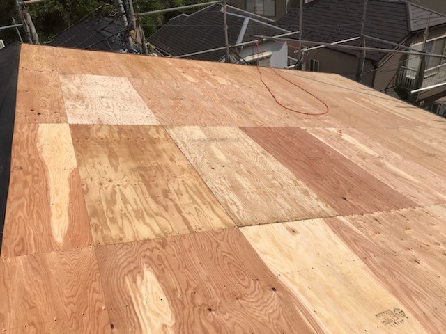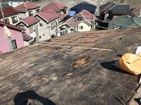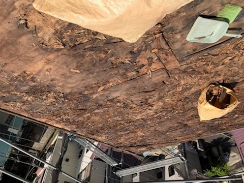 神奈川県横浜市金沢区で鋼板屋根からの雨漏りの修理工事です。鋼板屋根の下に隠れていたスレート瓦を剥がしてみると、やはり大変な事になっていました。長年の雨水の浸水で野地板が完全に腐ってしまっている部分が何箇所か有りました。当初から雨漏りが発生しているのに原因をキチンと確認もしないで安易にカバー工法を施工した結果です。この様な下地の状況では、いくら鋼板屋根が長持ちすると言っても釘も効いていないので台風などで屋根材が飛んでしまう事も考えられます。ある日突然に腐食した屋根の木下地が裏側から剥がれて室内に落ちる事も有るかも知れません。本当に危険です。当社でカバー工法を施工しない理由です。とりあえず腐食した野地板を全て撤去して、不陸調整の木桟を敷き新規に野地の構造用合板が貼れる状態にします。
