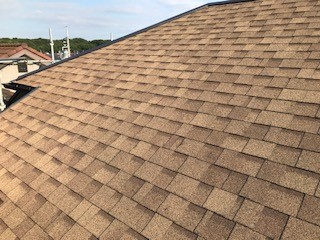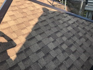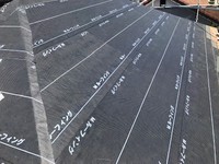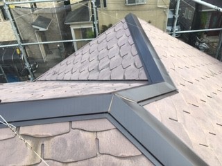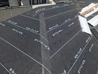 防水シート防水を敷きます。使用するのは一般的なアスファルトルーフィングシートでは無く改質アスファルト系のシートです。このシートは柔軟性があり耐破断性能も強く耐久性も強く安心です。このシートだけで強い雨でも雨漏りが発生しない様に施工します、軒先の水切部材を取り付けてその上にシートを被せる様にして下から貼り上げます。写真では分かりづらいのですが谷の部分は雨水が集まるので最初に谷に沿って上から下までシートを下貼りしています。棟も両側から貼り上げたシートをそれぞれ折り返して重ね貼りします。