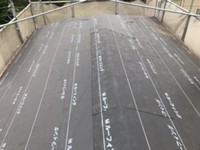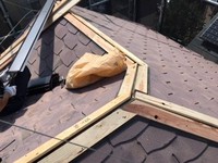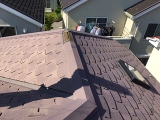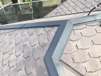 神奈川県横浜市金沢区でセメント瓦からの雨漏りの修繕工事です。防水シートの施工後、ファイバーグラスの屋根材を葺きます。写真では分かりづらいのですが、やはり屋根の木下地は長年のセメント瓦の重みで撓みが出ている状態でした。場所によっては3cmくらい沈んでいる部分もありました。この状況で、スレート瓦や鋼板屋根材を施工するのは厳しいのではないかと思います。ファイバーグラス屋根材の柔軟性と追従性が最適です。屋根材を葺き上げ棟などのガルバリウム鋼板の部材を取り付けて完成です。この屋根材は仕上がりに厚みが有り陰影も出て上質感が有ります。既存が瓦屋根の場合、葺き替えの時に新しい屋根の質感を気にするお客様も多くいますが、ファイバーグラスの屋根材は瓦屋根にも遜色のない仕上りなると思います。