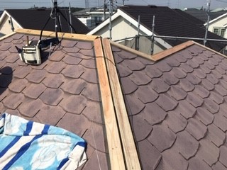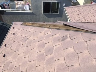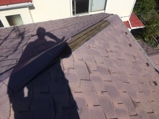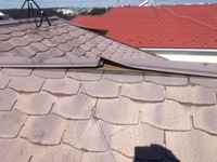 神奈川県横浜市港南区でスレート瓦屋根からの雨漏りです。お客様から二階の天井に染みが出来ていると連絡をいただいたので、伺って屋根に上がってみると強風でスレート屋根の棟の部材が浮いていたり、剥がれて飛んでしまっていました。スレート瓦の場合は勿論、10年毎の塗り替えが必要ですがその時に棟部材の下地の木桟のメンテナンスも必要です。スレート瓦は平らで表面が硬質なので雨が降ると瓦の表面に伝わった雨水が毛細管現象の様に棟部材とスレート瓦の隙間から内部に浸透してしまうので下地の木桟が腐食してしまう場合があります。そのままにしておくと部材を留めている釘が外れてこの屋根の様に風に煽られて浮いてしまったり、飛んでしまったりします。屋根のメンテナンスの時に留めている釘を確認すれば下地の木桟が問題無いかどうかすぐに判ります。この様事も含めて、屋根の塗装は塗装業者では無く、信頼できるけんち業者に施工を頼む方が安心かと思います。