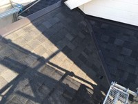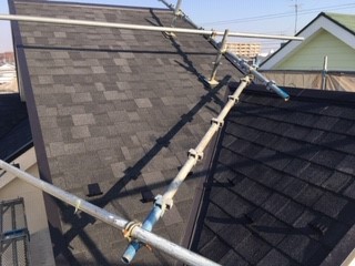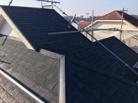 神奈川県横浜市金沢区で鋼板屋根からの雨漏りの修繕改修工事です。防水シートやガルバリウム鋼板部材の施工が終わり、ファイバーグラスの屋根材を葺きます。この屋根材は釘と接着剤の併用で施工します。重ねに接着剤を使用している事で雨水の侵入を防ぎ、強風などで剥がれる事を防ぎます。また表面はセラミック処理で耐候性能も高く、柔らかい素材なので葺き替えの場合などの屋根の微妙な撓みなどにも追従するので安心です。以上の事から勾配の少ない屋根にも問題無く使用出来ます。仕上がりは厚みの有る感じで質感も有り屋根の雰囲気も変わりました。お客様にも喜んで頂き、安全対策の足場を利用して外装の塗装工事もさせていただきました。