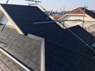 神奈川県横浜市瀬谷区でスレート瓦屋根からの雨漏りの修繕改修工事です。屋根下地補正の耐水合板の上貼り後、防水シートを敷き、ガルバリウム鋼板の軒先と袖の部材を取り付け、ファイバーグラスの屋根材を葺きます。補正の耐水合板を貼ってある事で防水シートを留めるステップルの効きもファイバーグラスの屋根材を留める釘の効きも格段に良くなり材料の下地への馴染みも良くなります。写真でも解る様に勾配も急でかなり複雑な形状の屋根なので各部の取り合いも多く割と手間が掛かりますが、ファイバーグラスの屋根材は切断加工も比較的容易で屋根下地や部材への追従性も良く、この様な形状の屋根には最適です。以前のスレート瓦使用の時よりも無理なく各部の取り合いの処理が出来ました。これでこの先長年の間、雨漏りの心配も無く、安心して過ごして頂く事が出来ます。