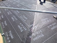 神奈川県横浜市金沢区で鋼板屋根からの雨漏りの修繕改修工事です。お客様に現状を説明して納得して頂き、葺き替え工事を施工する事になりました。今回も勾配の少ない屋根の形状と寄棟である事、谷が有る事などを考慮してファイバーグラスの屋根材を提案しました。先ずは既存の鋼板屋根材を撤去して、下地補正の耐水合板を貼り、防水シートを敷きます。防水シートは勾配の少ない事を考えて一般に使用するアスファルトルーフィングでは無く、改質系の防水シートを使用しました。この防水シートはゴム質のシートを繊維質を挟み何層かに仕上げたもので防水性も耐久性も強い優れたシートです。防水シートの施工後、軒先や谷などのガルバリウム鋼板部材を取付ければ、ファイバーグラス屋根材の施工です。