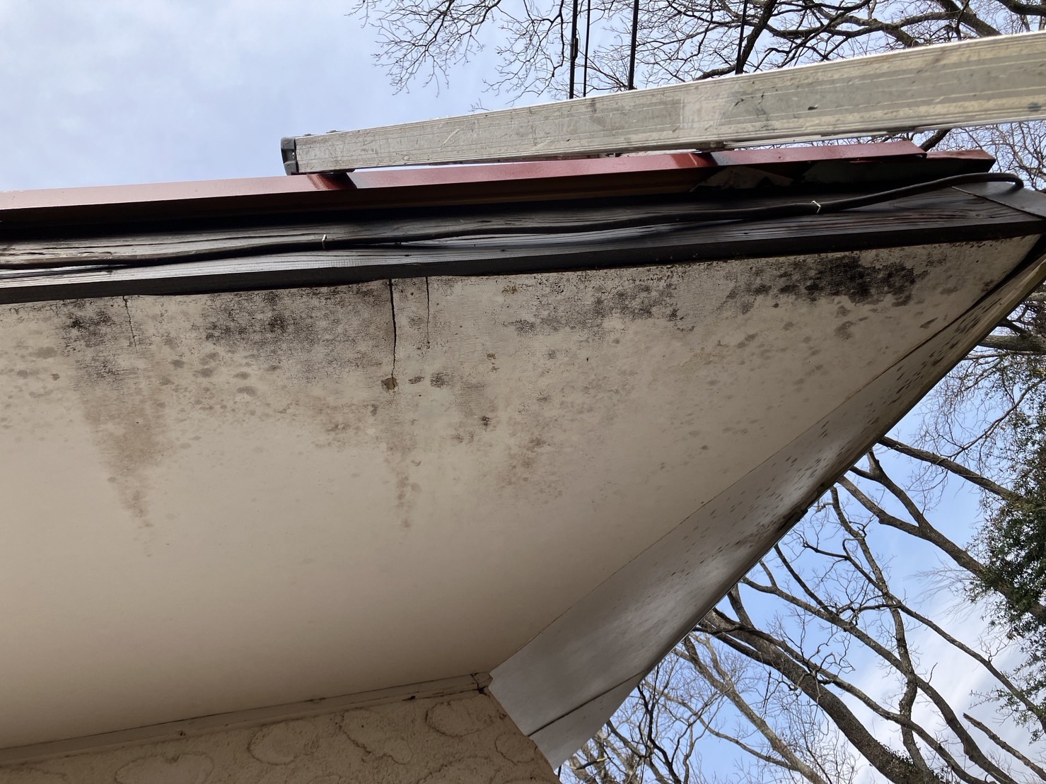 確かに軒天の破風側に雨漏りの痕跡と思われる染みがあります。