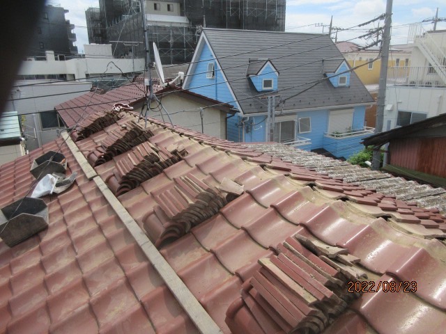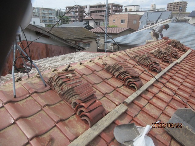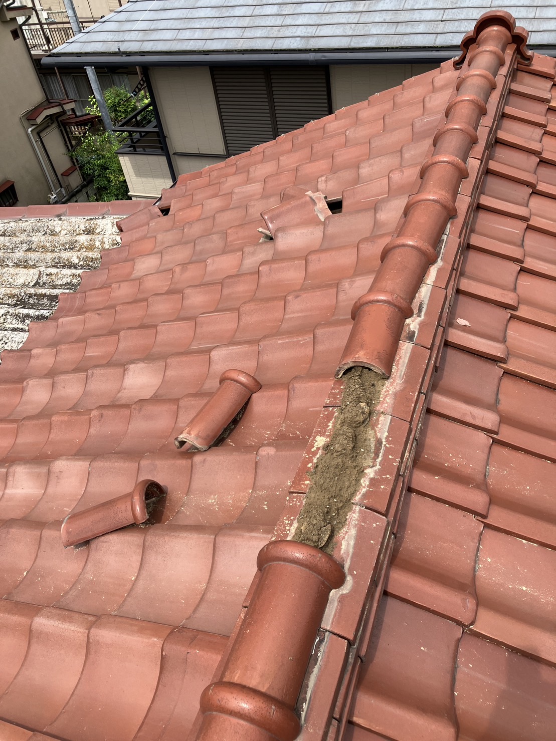 かなり築年数が経っている建物で屋根瓦の棟の面戸が風化してしまい、