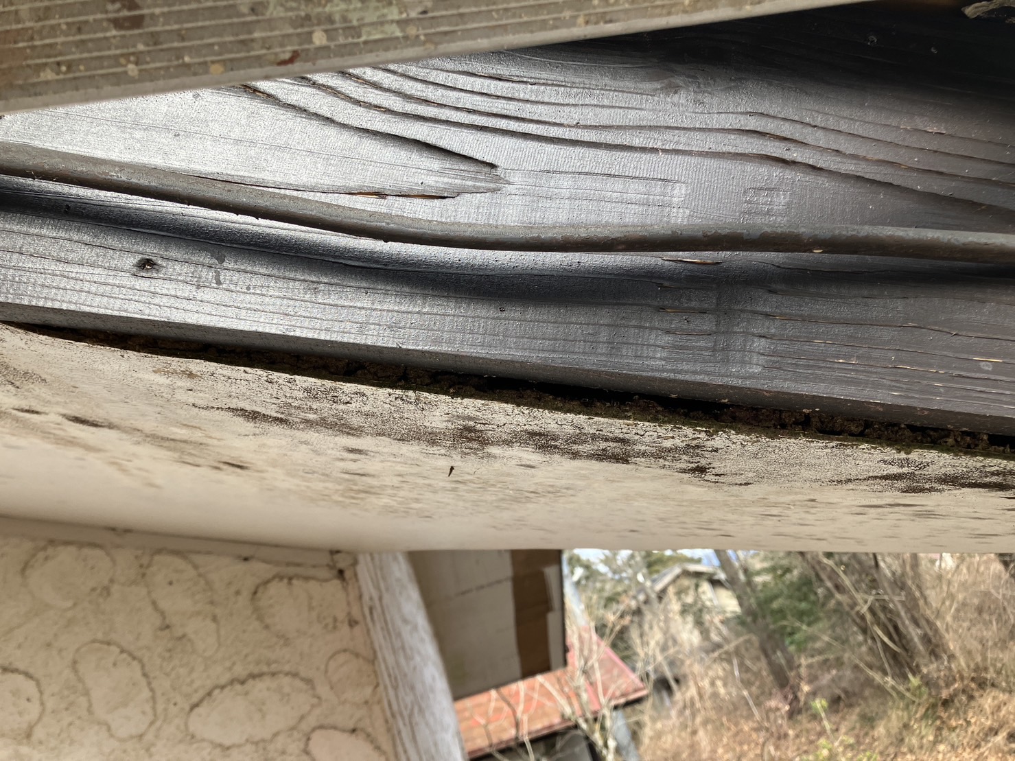 軒天を剥がし裏側から確認をする方法もありますが、なるべく経費を掛けずに直したいとのご要望でしたので、